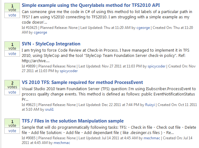 The guys behind the All-In-One Code Framework published a sample on using TFS events earlier this month. I’m not sure, but it may have been thier first sample covering TFS. They have more on their backlog. You can suggest sample ideas, and vote on other suggestions, too. To vote on suggestions, search for TFS in the sample request service.