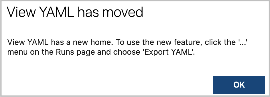 Following the directions in the dialog box, let’s see how the new experience works. First, we’ll export our pipeline as YAML.