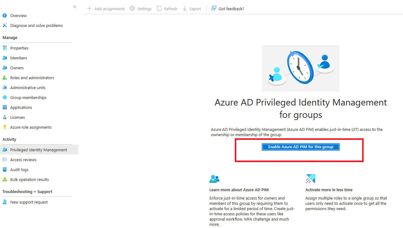 2. Once the group is created, click on the group and select Privileged Identity Management and click on Enable Azure AD PIM for this group button as shown below.Â