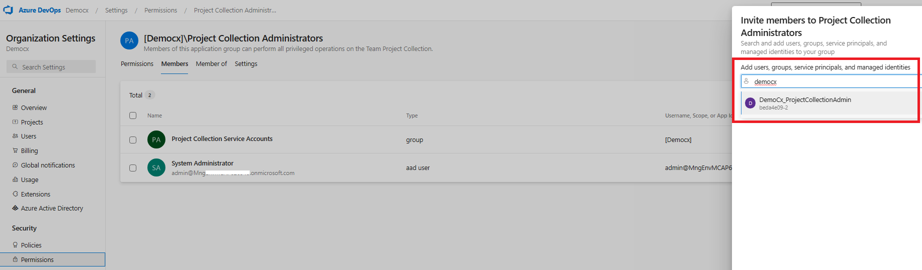 4. Now the approver (assuming that user is a Project Collection Admin) can login to Azure DevOps -> Organization Settings -> Permissions -> Project Collection Admin to check if the user (Demo User) is added to the security group and is reflecting ( just for the demo, here we show that user is available in the group. Generally user can login and check as in step 5)