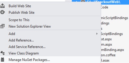 Add Knockout to an existing project by selecting “Manage Nuget Packages…”: