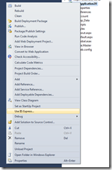For both WAP and Website projects which were using Cassini we have a very simply method for you to use IIS Express. You can just right click then select the context menu option “Use IIS Express”. Take a look at the screen shot that follows for that command.