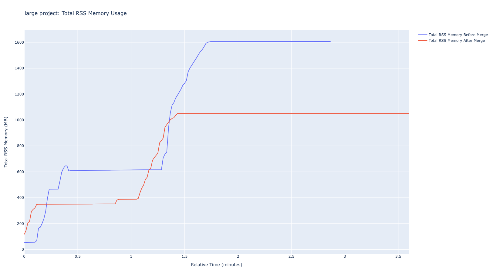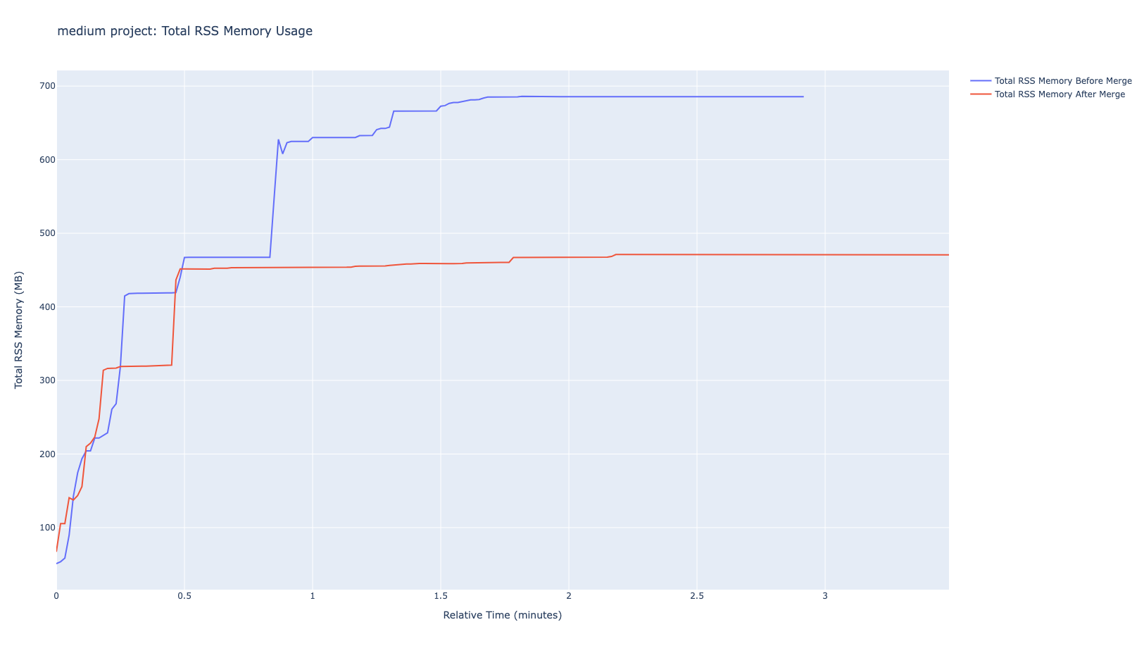 然而,在将其添加到插件包之前,我们发现该插件的架构需要一些改进。具体来说,该插件会启动多个 JVM 进程来提供不同的功能,这会占用过多的计算资源。因此,我们决定进行一些优化——简单来说,我们将这些不同的 JVM 进程合并为一个,从而减少了 JVM 进程的数量,并显著降低了使用该扩展时的内存消耗。以下是不同项目大小下的内存消耗对比。